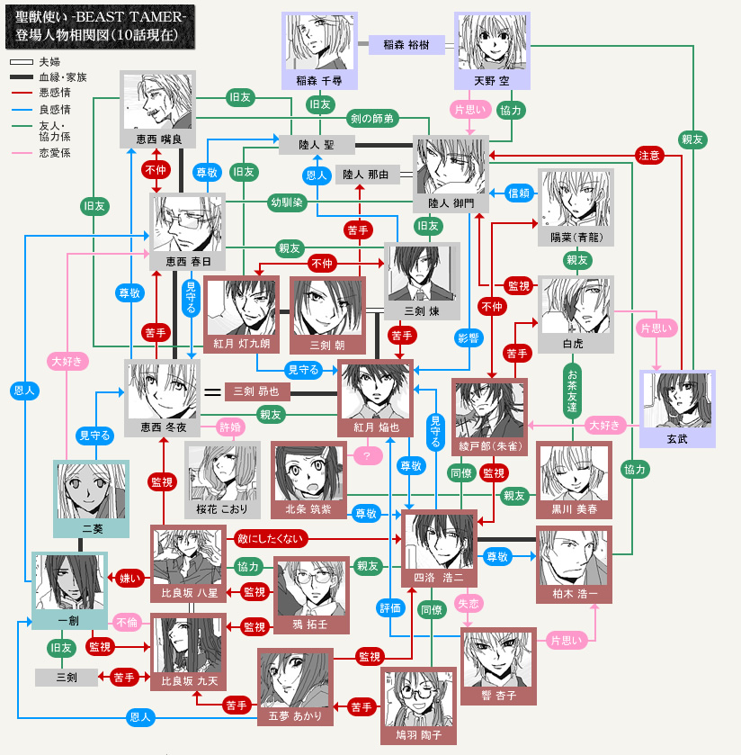 恵西 冬夜(えにし とうや) 白虎学園長の義理の息子であり、白虎学園3回生にして生徒会長。18歳。 温和な性格で学園生に大変人気がある。しかし一旦キレると世にも恐ろしいらしい。 幼い頃の記憶を失っており(行方不明になった焔也の兄・昴也と思われる)、それ故に自我の固定力が弱い。白虎域から姿を消したが、朱雀域にて七月に追われ、負傷して倒れているところを焔也に保護される。 操る聖獣はなぜか関西弁を話す「アジャンタ」。 一見思慮深いようで場当たり行動を起こすことが多い。元来人見知りも激しいが、焔也と話す時はとてもリラックスできるようだ。 |
